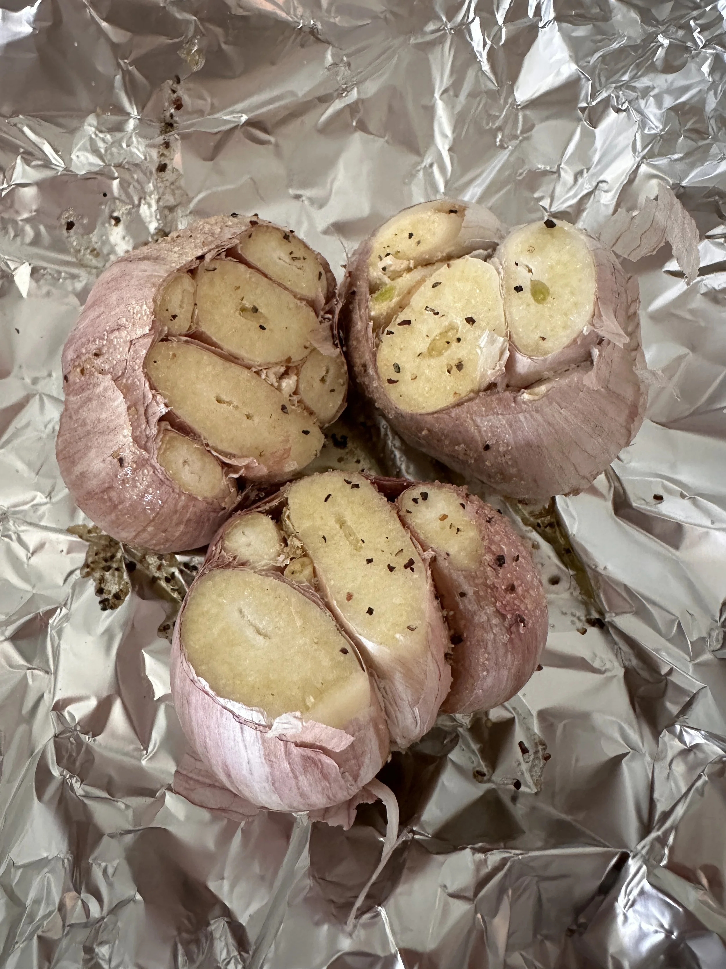 Place garlic heads cut side down on a baking sheet or wrap in tinfoil and roast for 1 hour or until the cloves of garlic are soft. Allow to cool until you can handle it